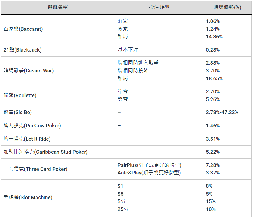 常見遊戲 – 賭場優勢排行和賭場優勢整理表格 | 發樂娛樂城